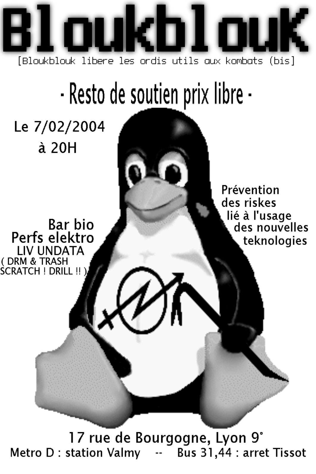Pour ceuxelles qui n'étaient pas là... Le restau du samedi 7 février 2004 s'est vraiment bien passé. Plein de gen+tes étaient mobilisé+es pour que tout soit bien organisé et merci merci. Une centaine de personnes sont venues. Il y a eu à manger pour tout le monde et c'était bon. Il ne reste pas de stocks de bières et on ne devrait pas être déficitaires du tout, même si la collecte pour le prix-libre du resto a été un peu mal annoncée. On a pu faire la connaissance de quelques personnes qu'on ne connaissait que par la liste, parfois venus de loin pour nous voir; on a pu un petit peu discuter et ça donne plein d'idées d'ateliers, d'actions, de réflexions. Un peu de recrutement et bloukblouk va doubler son effectif d'actif+ves. On a même rédigé un tract qui a pu être distribué à tou+tes (trop dense a dit Thibault). Par contre le tract est dans une des machines, on avait pas de disquette pour le copier ailleurs, donc on ne peut pas encore en faire profiter le reste du monde... Mais ça ne devrait pas tarder. Et succès non négligeable: la salle de bloukblouk est rangée et opérationnelle (méconnaissable), même qu'on a eu droit à des remarques sympathiques comme quoi ça donnait envie d'y rester! -- Précisons quand même que la salle de bloukblouk n'a pas été ouverte au public ce soir là, qu'on a dit aux gent+es intéressé+es de venir un vendredi entre 16 et 21h, parce qu'on avait trop peur de pas arriver à gérer. Bref, ça donne envie de recommencer!